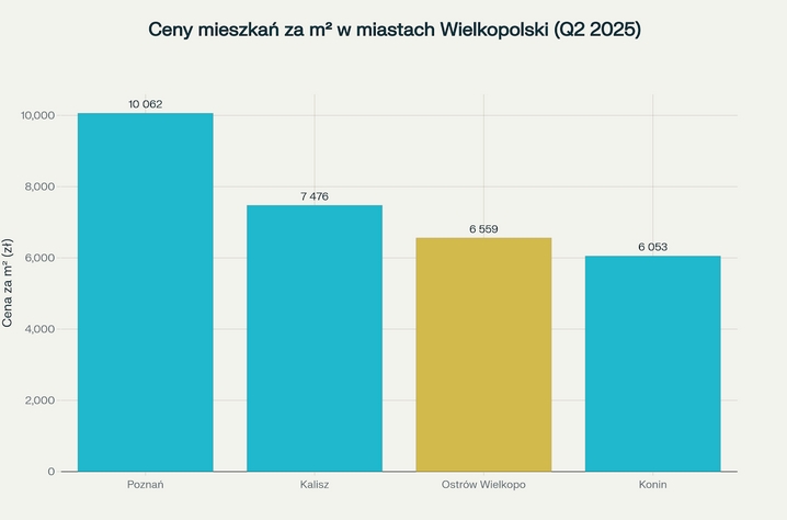 Ostrów Wielkopolski prezentuje się jako ekonomiczna alternatywa mieszkaniowa w porównaniu z większymi miastami województwa wielkopolskiego. Według danych za drugi kwartał 2025 roku, mediana ceny mieszkań 6 559 zł/m² plasuje miasto w atrakcyjnej pozycji cenowej.